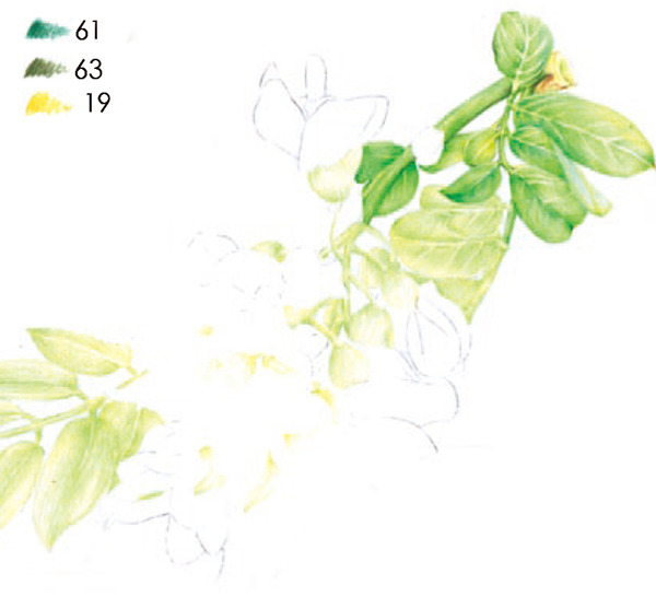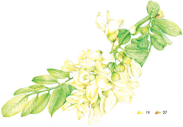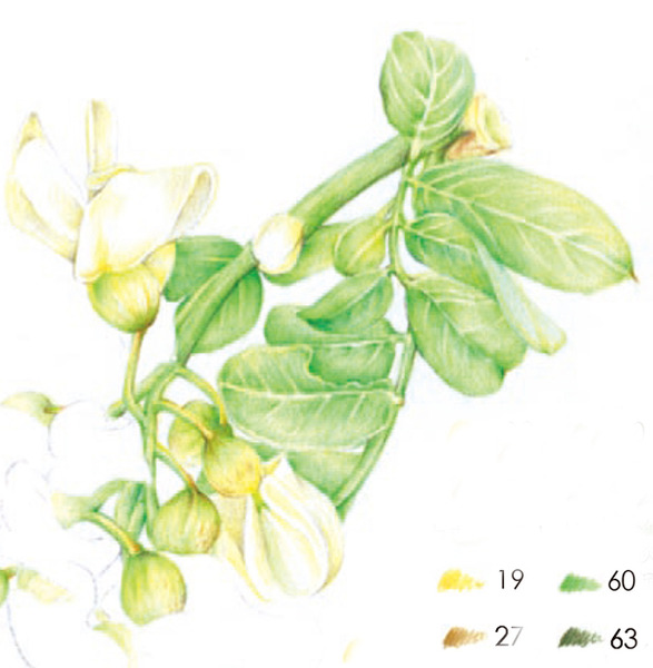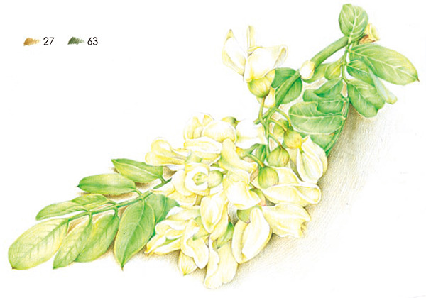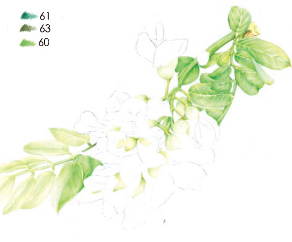 注意颜色不要画脏了。花朵的花托用60号草绿加63号橄榄绿叠加在一起画出,亮处用19号中黄色提亮。