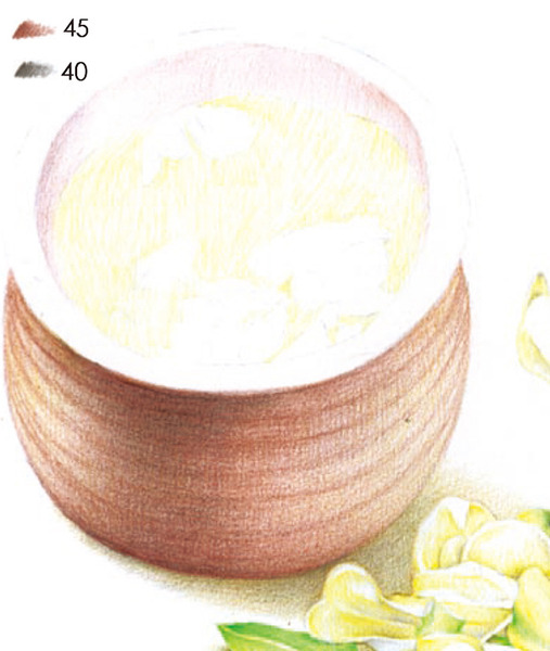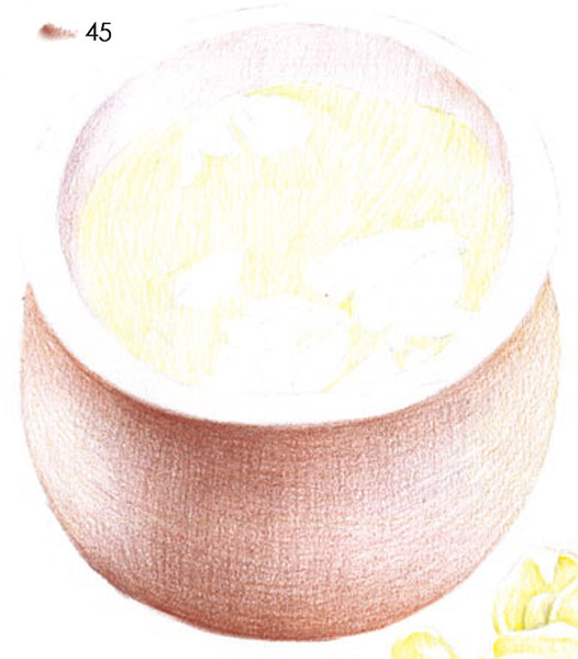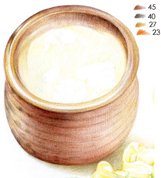用23号橙色给杯子提亮。最后用40号深褐色加深杯子的最深处。