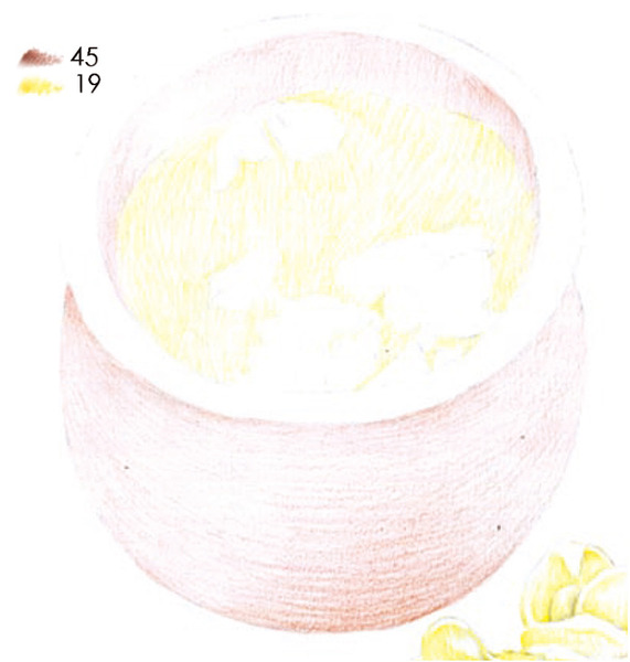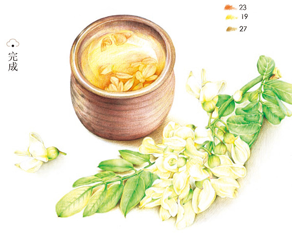 Step13:最后一步,用23号橙色加27号黄褐色画出槐米茶的颜色和明暗变化,把19号中黄色作最后的提亮。