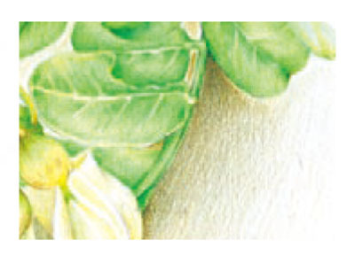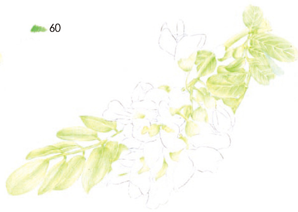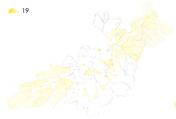 Step2:中黄色的色调铺好后,开始给叶片上初步的颜色,用60号草绿色在19号中黄色上面叠上一层。
