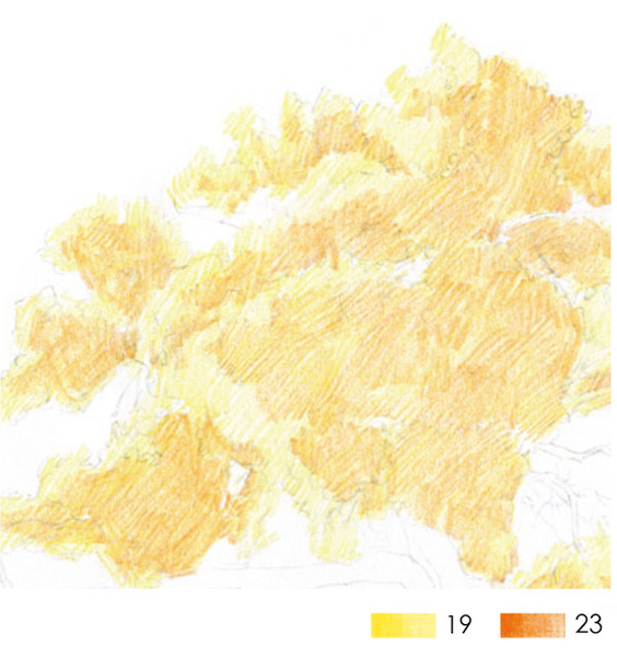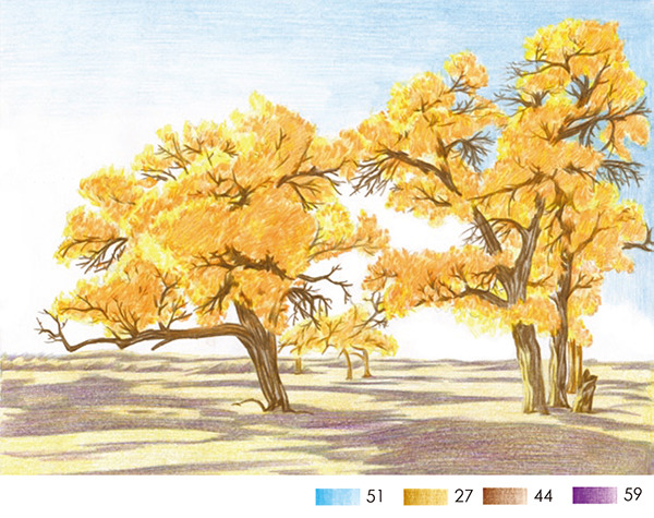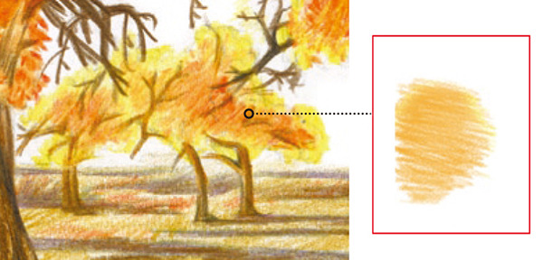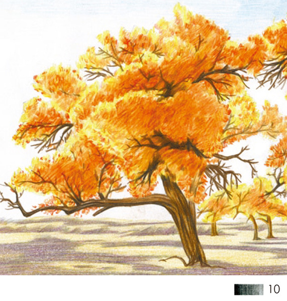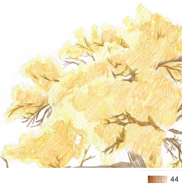 STEP4:第二遍上色,用19号中黄将树叶整体加深,用18号桔红模拟树叶的形状画出短小的线条加深树叶的暗部。