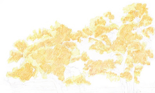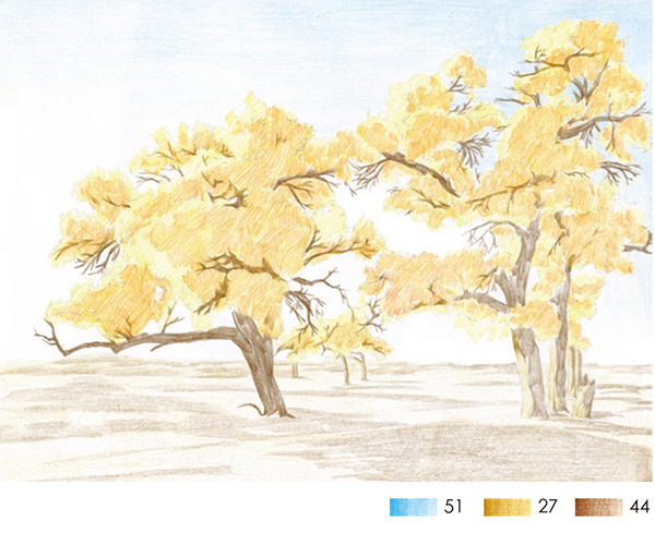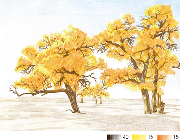 STEP1:将所有的树叶想先整体铺上19号中黄,然后用23号橙色加深树叶的暗部。并用此方法将所有树叶都画出。