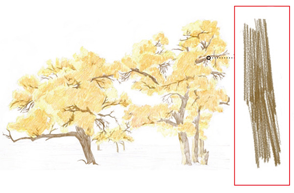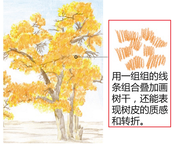 用一组组的线条组合叠加画树干,还能表现树皮的质感和转折。