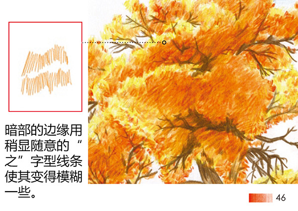 STEP9:用46号朱红色将树叶画得更深更红。刻画的笔触可以更短更小一些。