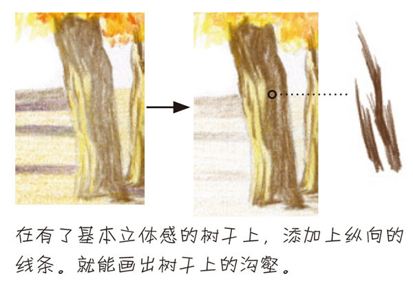 在有了基本立体感的树干上添加纵向线条就能画出树干上的沟壑。