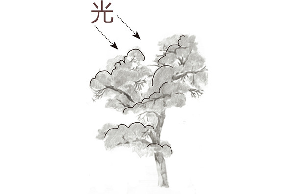 注意光从左上方来,树叶上的亮部也都集中在树梢左上方。