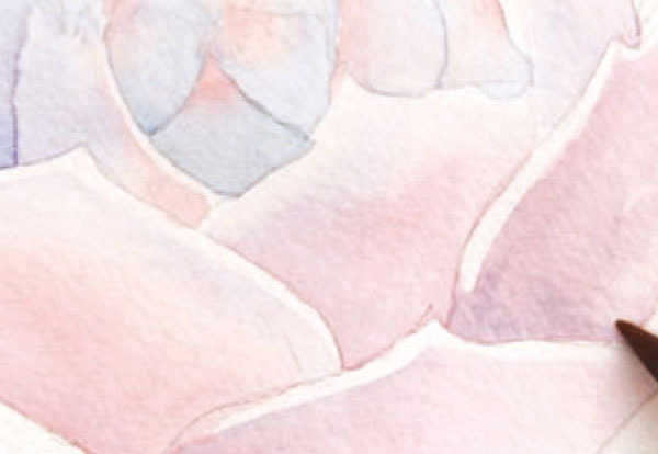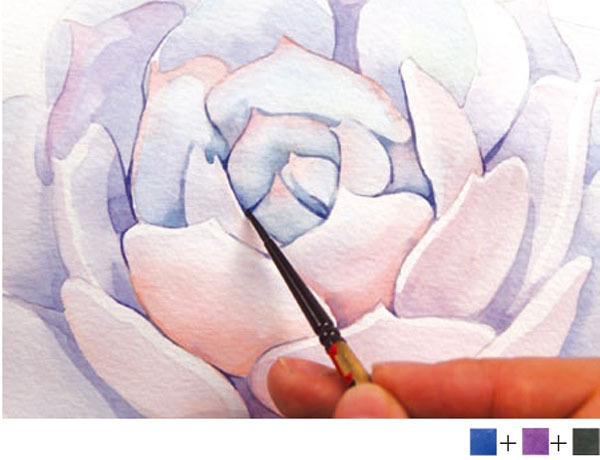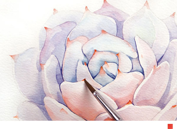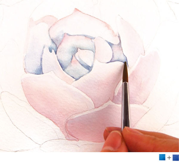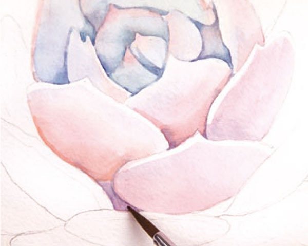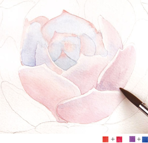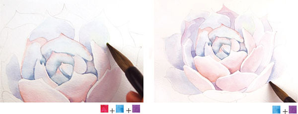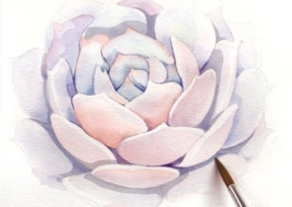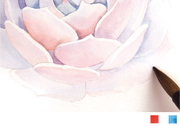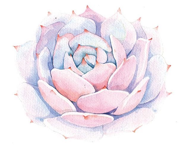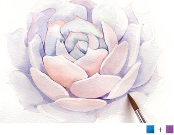STEP9 用天蓝色、紫罗兰以及一点点玫瑰红相互与大量的水调和,用渐变和重叠为外层叶瓣和层级投影上色,用色浅,处理出多肉的空间的虚实关系。