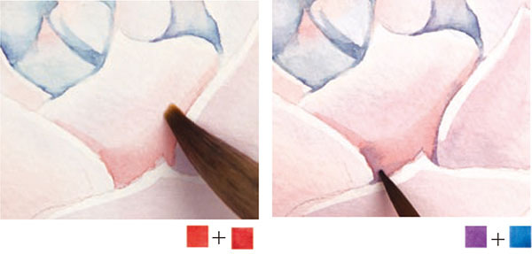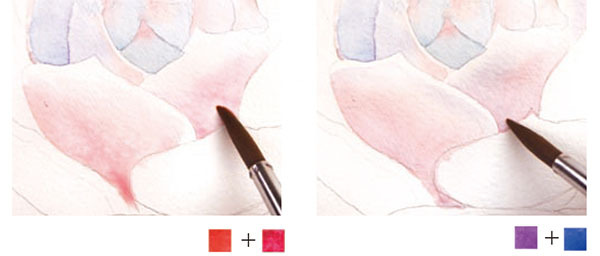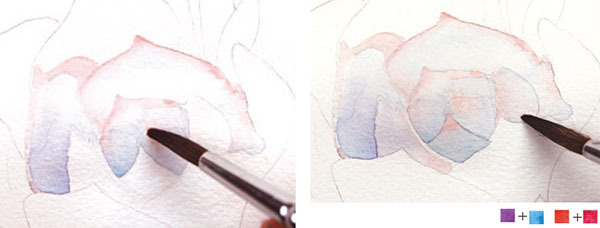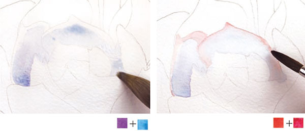 STEP7 用桔红加一点点大红色与足量的水调和,为叶瓣层级阴影渐变上色。然后用紫罗兰加普蓝与少量的水调和,在颜料未干时重叠。