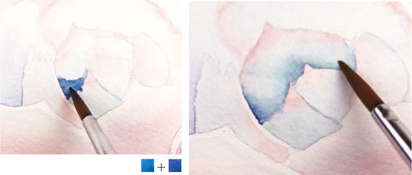 STEP5 用普兰加少量群青与少量水调和在暗部少量上色。加水渐变,使暗部上色更加自然,同时明确出叶瓣的亮部边缘。