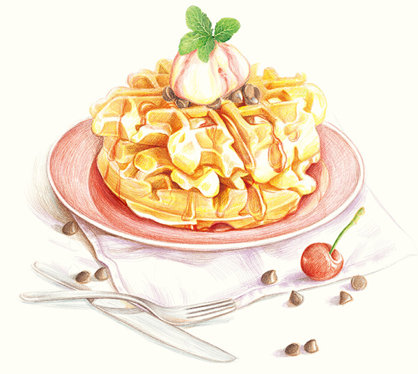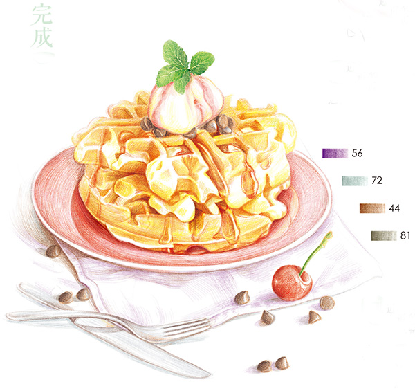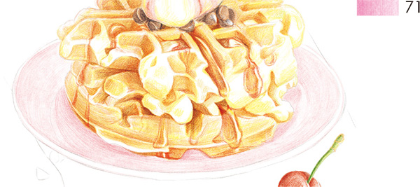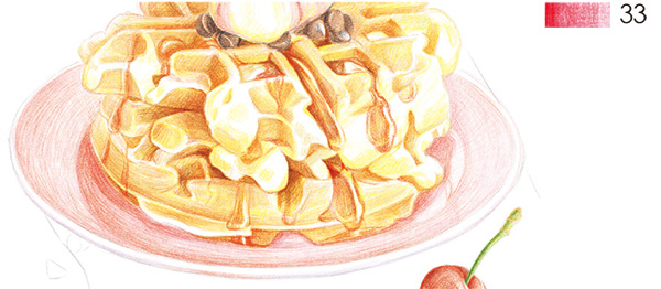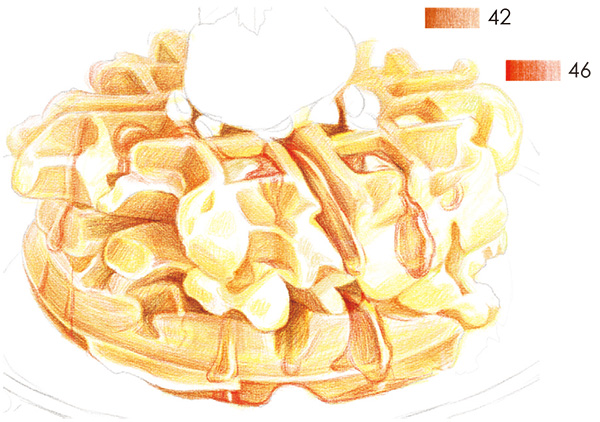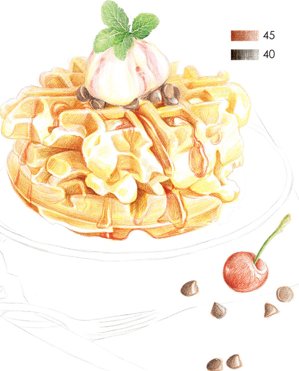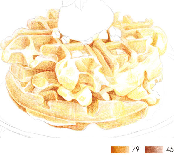 Step4:用79号黄赭色加强华夫饼暗部的描绘,颜色最深的缝隙处用45号红赭色细细地勾勒出来。