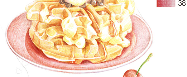 Step10:用38号曙红色强调盘子的暗部,例如华夫饼附近的位置和盘子的边缘。