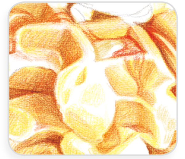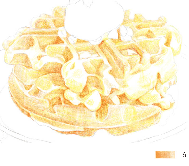 Step3:用16号橙黄色初步画出华夫饼的明暗关系,尤其要注意格子处亮面和暗部的描绘,
