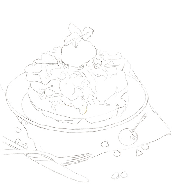 画完主体后,再画出刀叉和餐布,最后加上一枚樱桃和散落的巧克力豆,