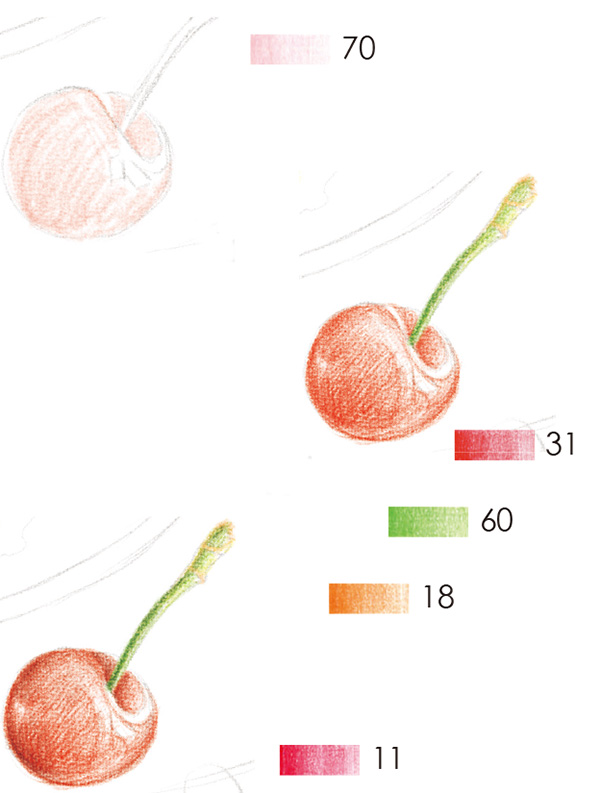 用60号草绿色和18号桔红色画出樱桃梗,最后用11号深红色画出樱桃的暗部即可。