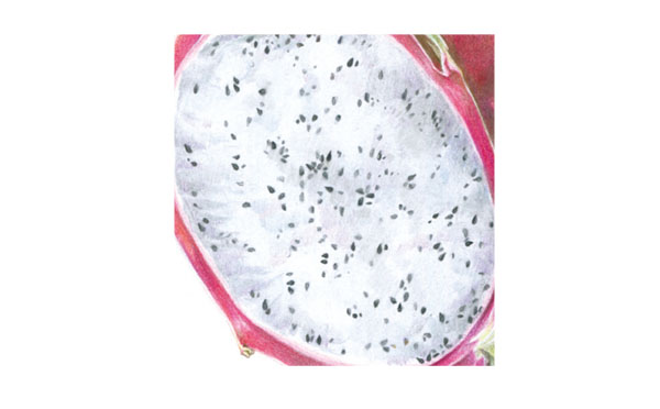 Step10:切开的火龙果只有四周一圈有粉色果皮,可以用36号玫瑰红在果肉周围铺上一圈底色表现。
