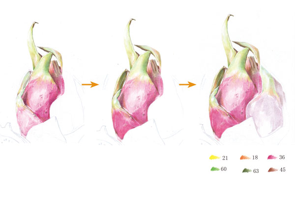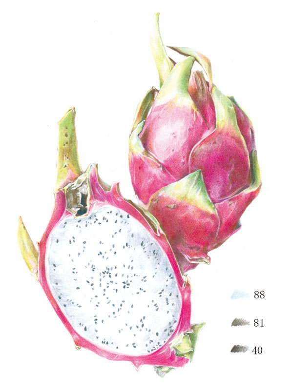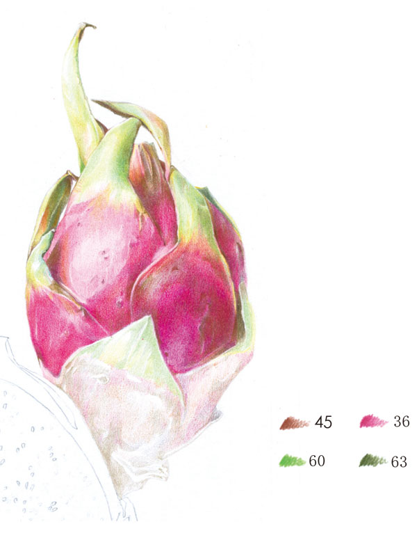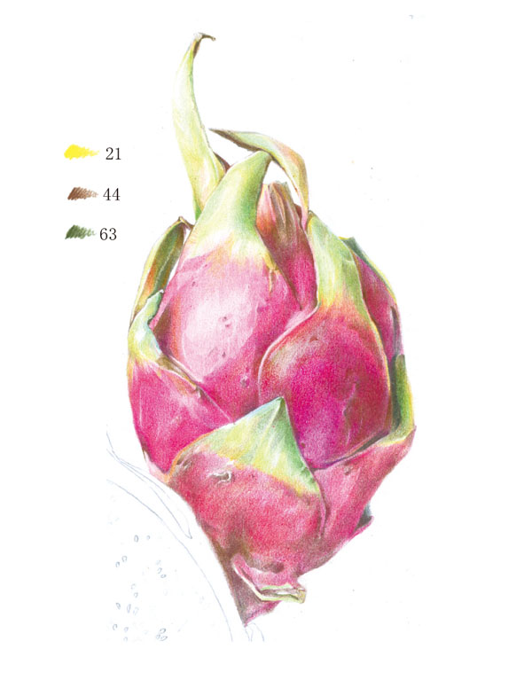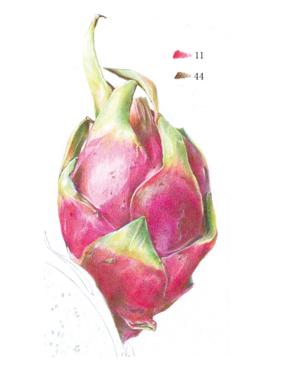 Step7:这颗火龙果底部的两片果皮要比其他果皮深,不过不要用黑色表现,容易脏,