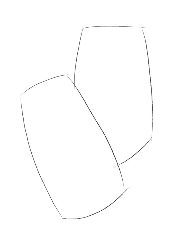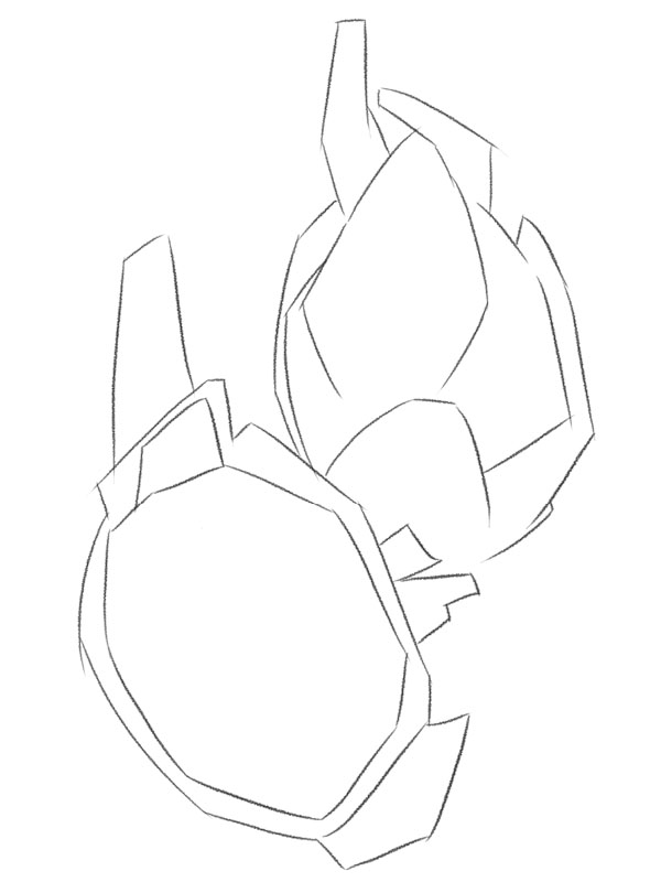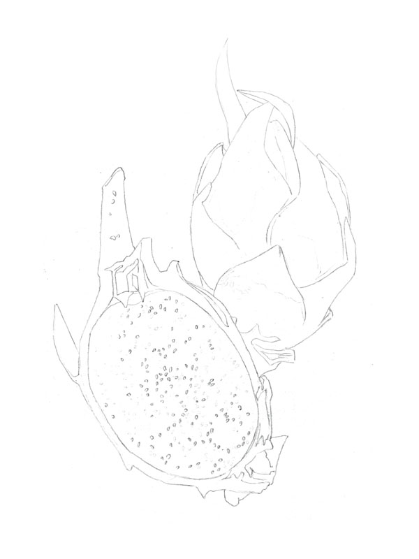 大致勾勒出火龙果的外形,右上方是一整个火龙果,注意画出果皮部分。