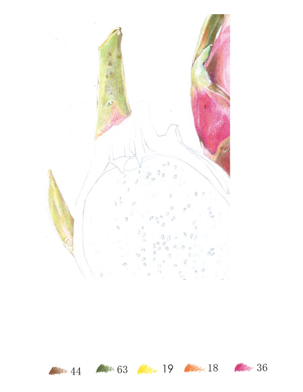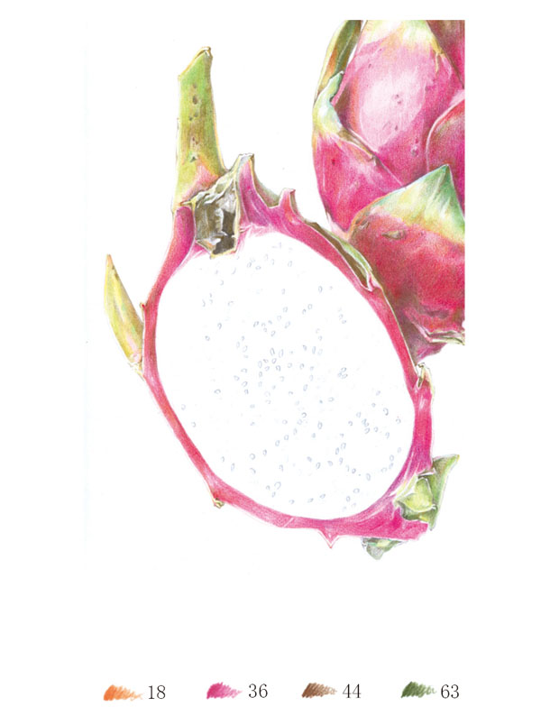 而与粉红色果皮连接的部分可以用36号玫瑰红和18号桔红上色。
