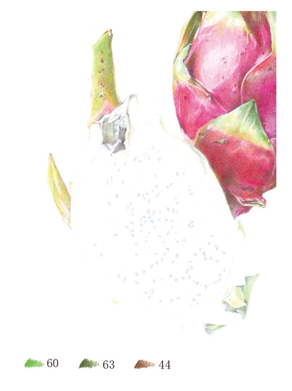 绿色果皮尖角部分的暗部可以用63号橄榄绿铺色,亮部可以用60号草绿色上色。