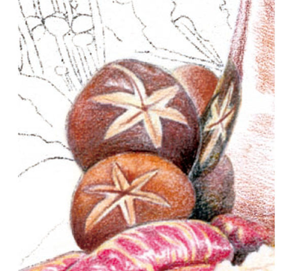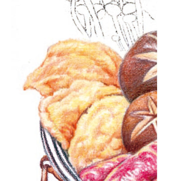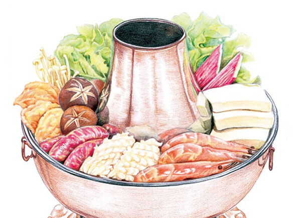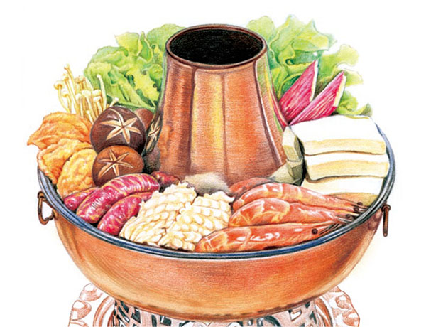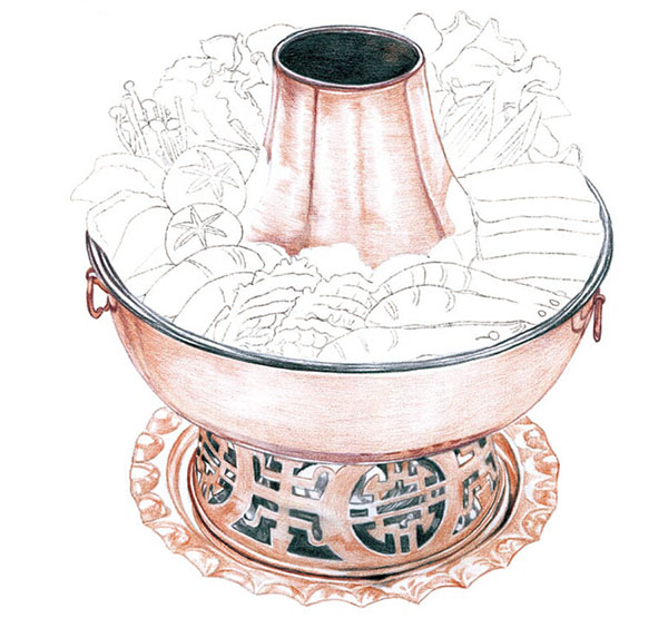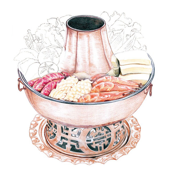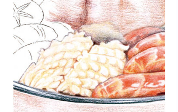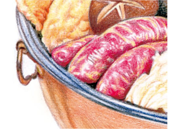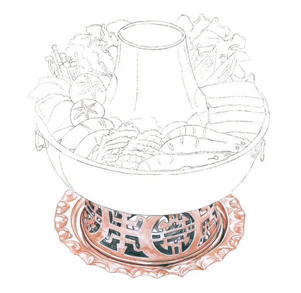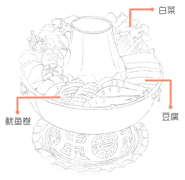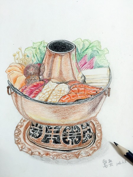 这个铜锅擦得比较亮,食物应射在上面的镜像比较清晰。画的时候注意形状的变形。颜色要比实物深一些。