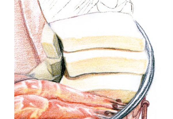 STEP4:鱿鱼卷被切成菱形的格子状。用22号桔黄把每个格子的暗部画出来。