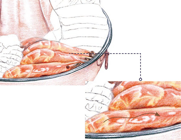 STEP6:用11号深红给香肠上色。把高光和浅色的地方留白。接着用22号桔黄画浅色的地方。
