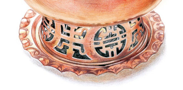STEP13:铜锅下面的部分跟上面的不同,因为有镂空的雕纹,颜色变化也比上面丰富。