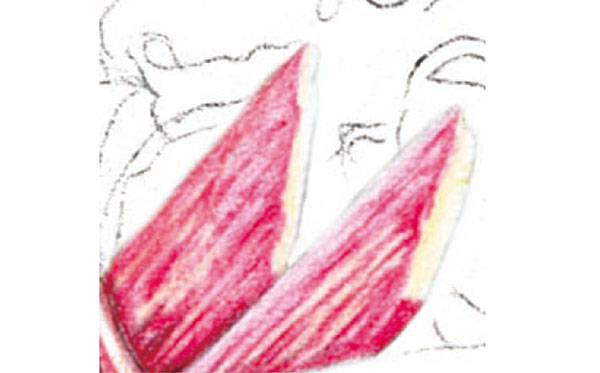 蟹棒上条状的浅色线条颜色有些微弱变化,中间用22号桔黄上色。周围用36号玫瑰。画的时候用笔要轻。
