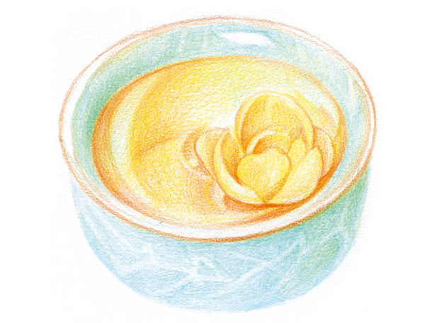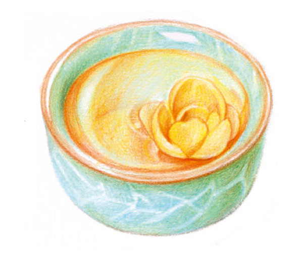 STEP6:酒杯上漂浮着象征时令的腊梅花,先用19号中黄色涂出花瓣的底色,再用16号橙黄色加深花朵的明暗。