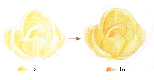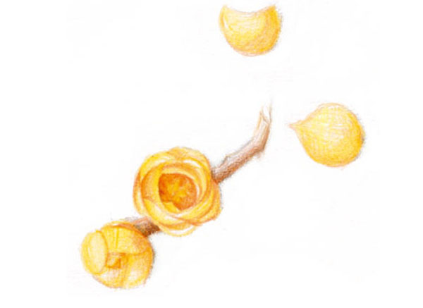 STEP10:画出桌面上散落的腊梅花枝和花瓣,先用19号中黄色均匀涂出花瓣的底色,再用16号橙黄色画出花瓣的明暗关系。
