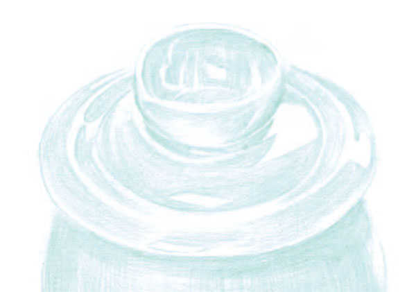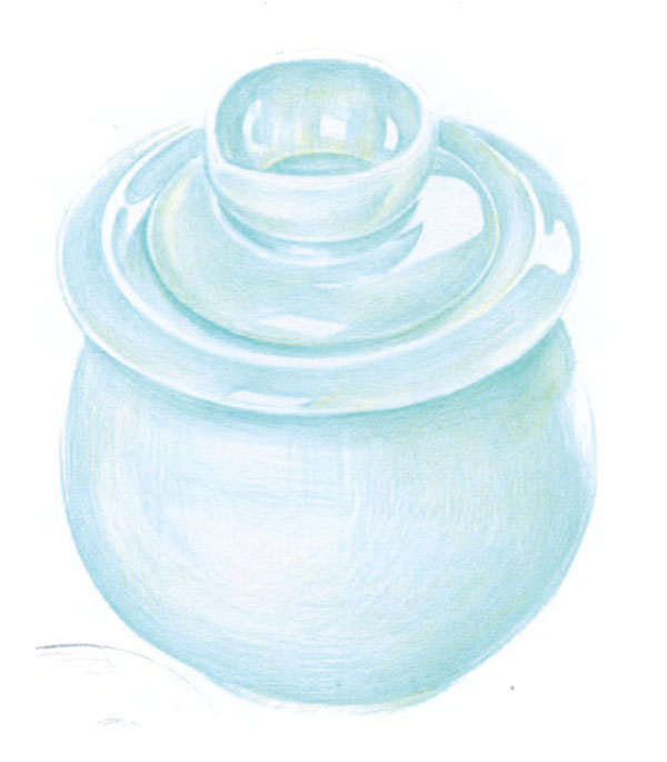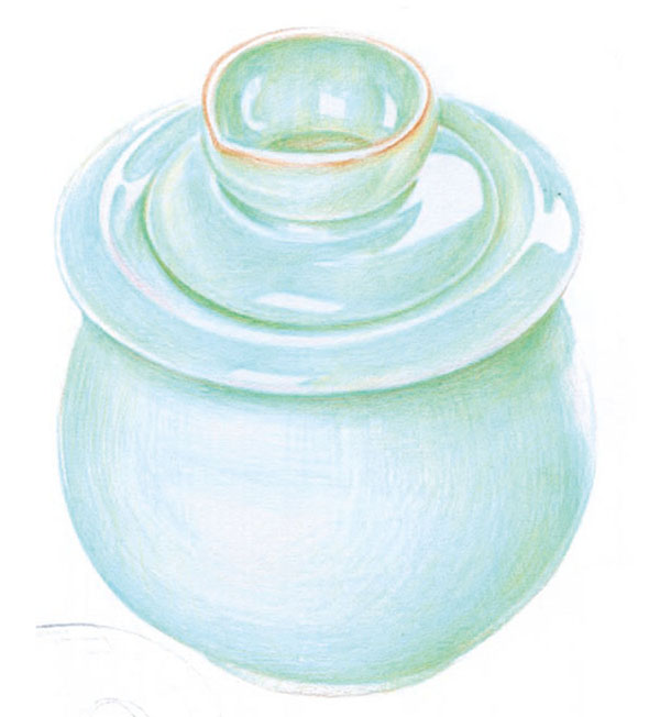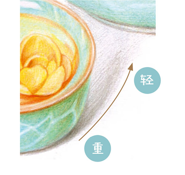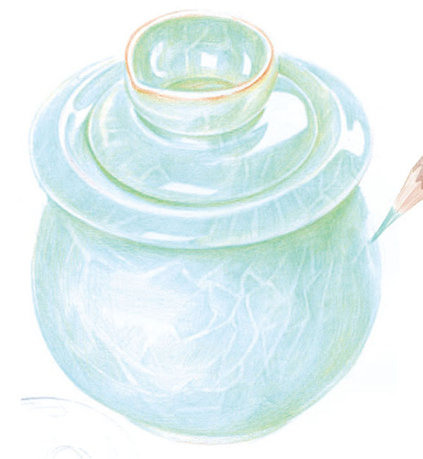 STEP2:将62号粉绿色铅笔削尖,用更加细腻均匀的笔触进行叠色,使陶瓷光滑的质感初步显现出来。
