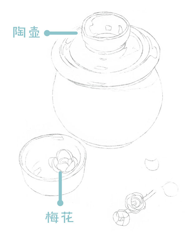 陶壶:用圆滑的弧线来画陶壶,为了保持壶身的对称,左右两边的线条弧度也要对称。