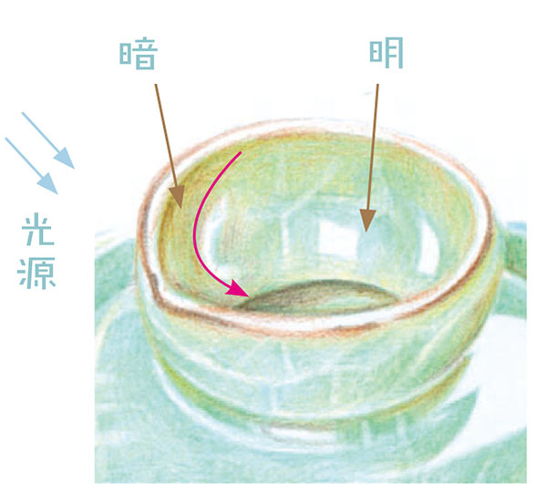 所以壶口左半部处于背光,为暗部,而右半部受光而为亮部。