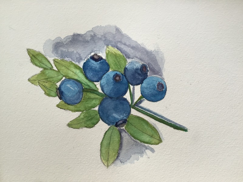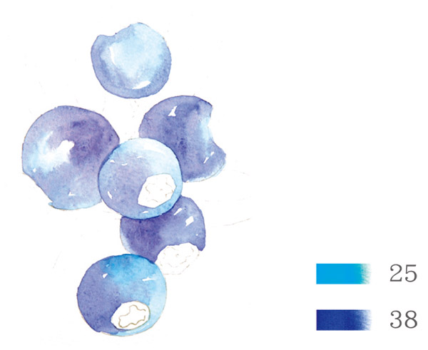 再用群青色调和多一些水,在天蓝色未干时晕染出蓝莓的暗部。