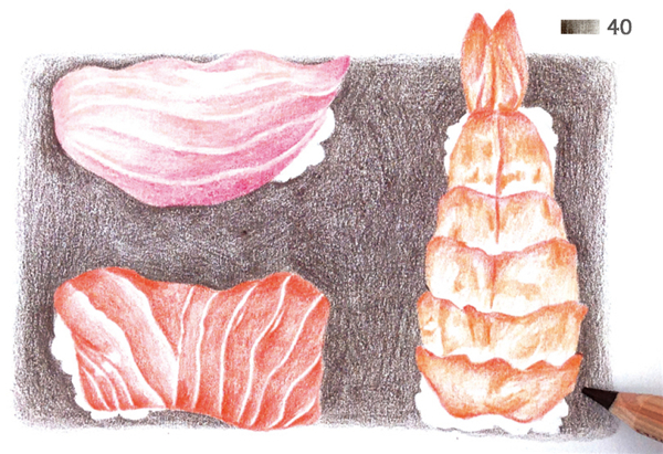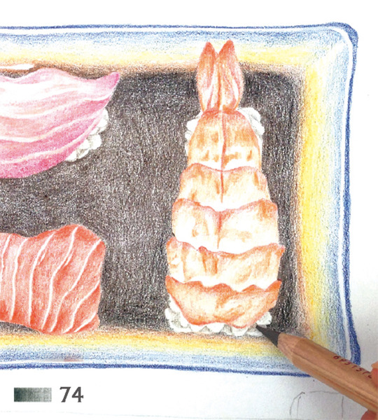 Step10:寿司的米饭部分则用74号深灰色来仔细描画,轻轻画出米粒之间的阴影即可。