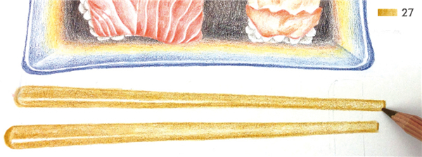 Step11:接着用27号黄褐色涂抹筷子的颜色,画的时候注意加重筷子两端的颜色,表现出筷子的立体感。