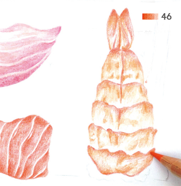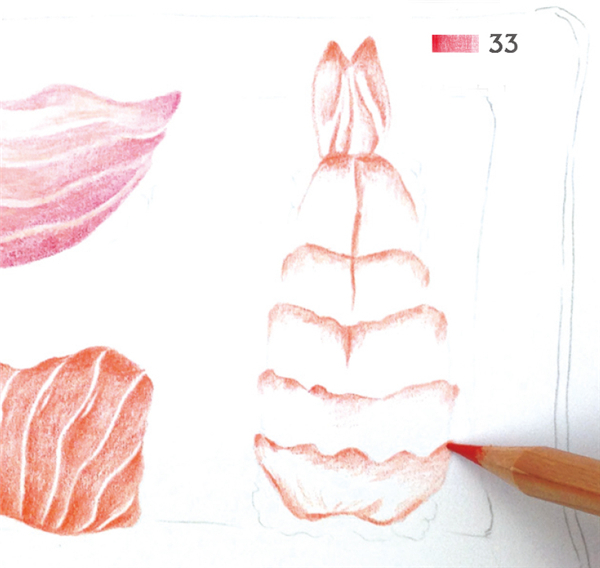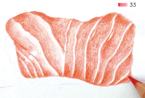 Step3:接下来用33号淡红色给三文鱼上色,画的时候注意仔细留出白色的条纹,