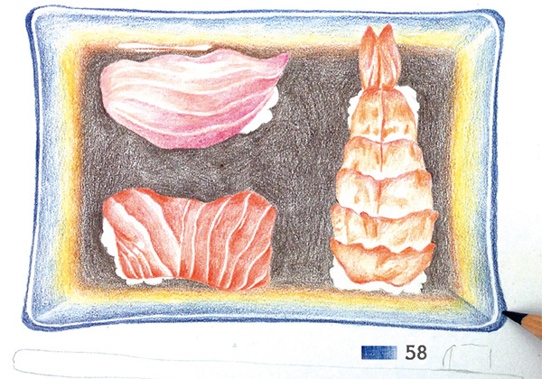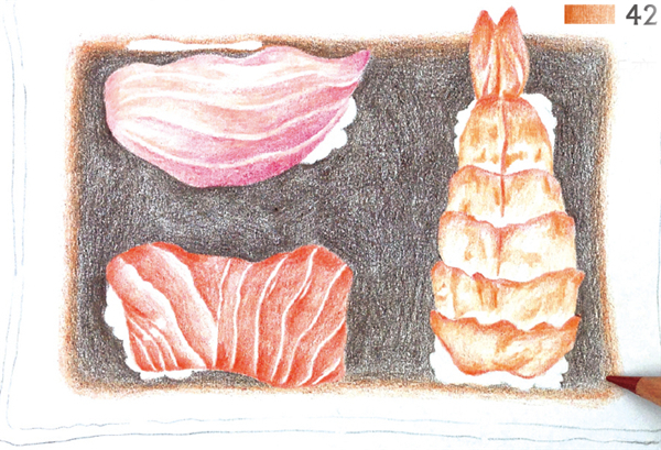 Step1:用橡皮擦淡铅笔稿,开始给金枪鱼寿司上色。