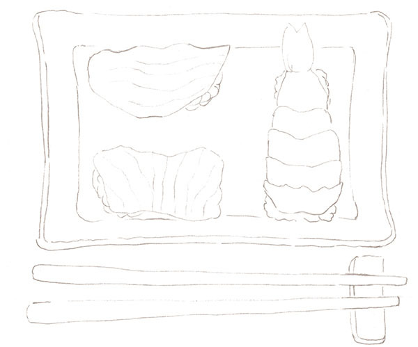 筷尖处的阴影面积稍大一些,表现出筷子与桌面的距离。素雅的寿司完成了。