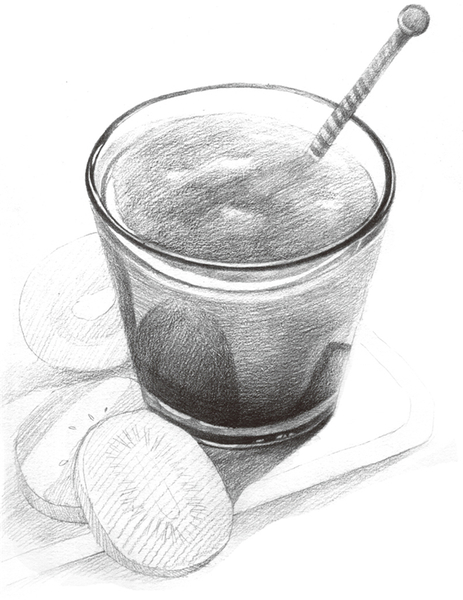 杯底质感的刻画也能很好地体现玻璃杯透明的质感,用4B铅笔加深杯底的颜色,