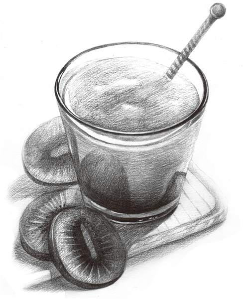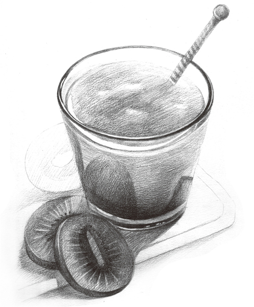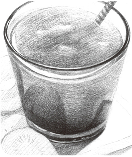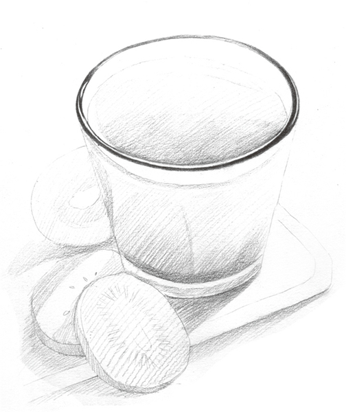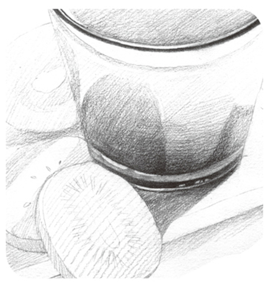 猕猴桃的颜色映衬到玻璃杯上,用4B铅笔层层地加深半椭圆状的阴影颜色,从底端到上面呈渐变状。