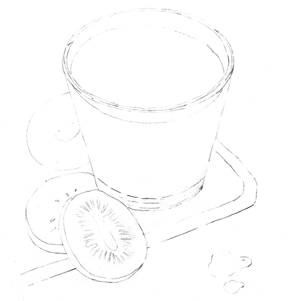 然后在杯子和猕猴桃的暗部轻轻地铺出大概的明暗关系和阴影。