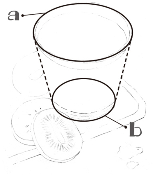 画杯子的时候要准确画出杯口和杯底的透视关系,杯口椭圆a比杯底椭圆b的面积更大,